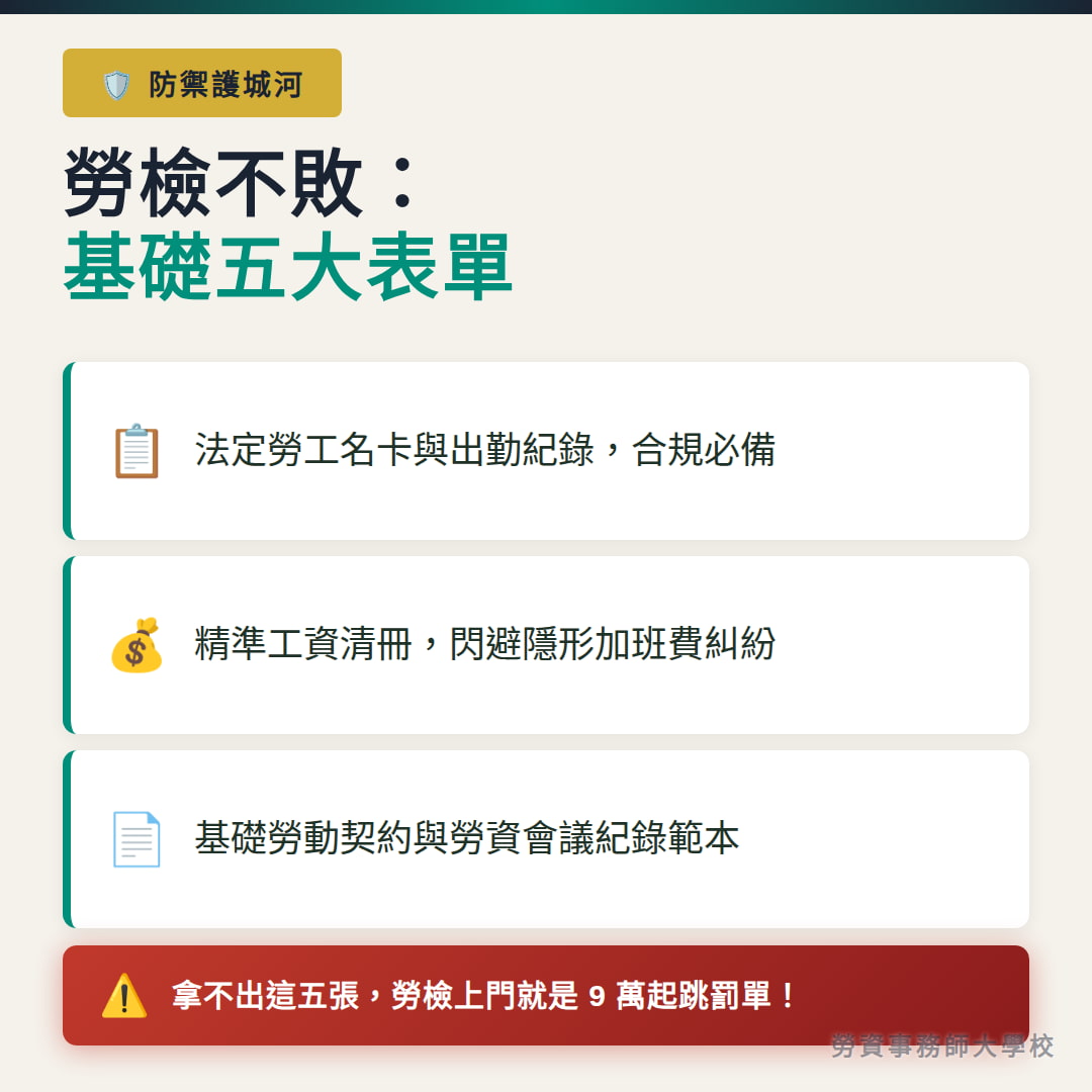 - 企業防護盾|勞檢不敗五大基礎表單: 包含勞動契約、工資清冊、出勤紀錄,完美攔截勞檢罰單。