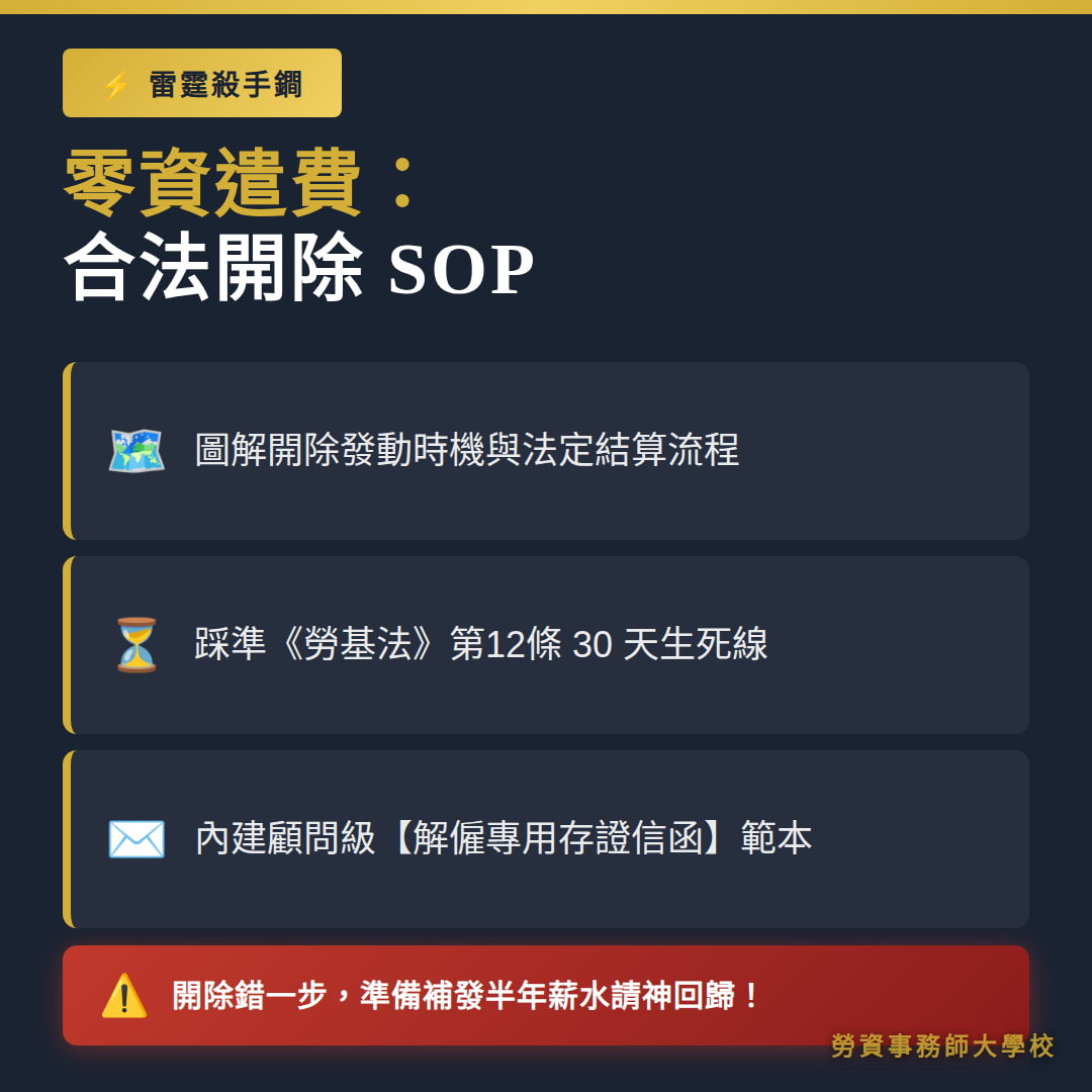 - 雷霆手段|合法開除 SOP + 專用存證信函: 符合第 12 條,免付資遣費俐落切除毒瘤,阻斷法律爭議。