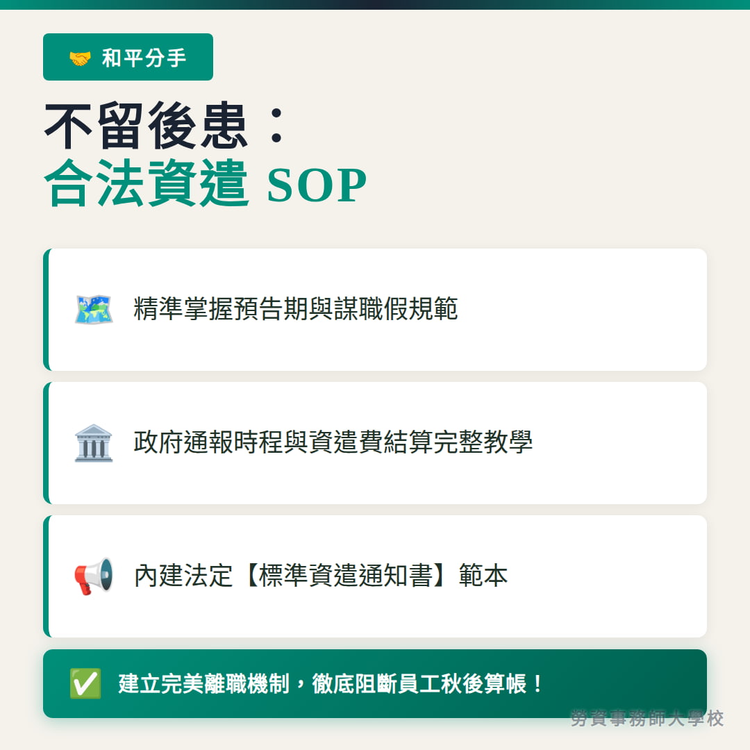 - 和平分手|合法資遣 SOP + 資遣通知書: 精準掌握第 11 條流程與預告期,建立不留後患的離職機制。