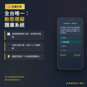 - 必勝外掛|線上動態模擬題庫系統: 雲端連動最新法規,手機隨時刷題,練出考場肌肉記憶。